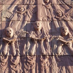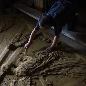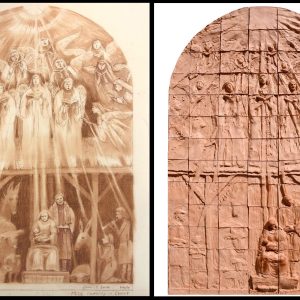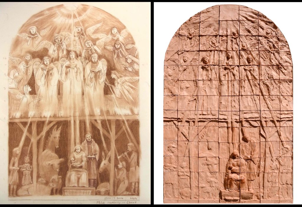「主の降誕」「受胎告知」そして「聖家族のエジプト逃避」という3点のレリーフはテラコッタ製で、粘土で1枚1枚のかたちをつくり、それを焼き上げて設置しています。最初のデッサンに3年くらい掛かり、その後1/5サイズの試作品もつくりました。そして迎えた本番は真夏の作業でした。粘土が乾いてしまうのを防ぐため、エアコンを入れていない作業場内で、3日の間に仕上げなければなりません。職人さんたちのサポートを受けながら、集中してかたちを整えていく作業は大変でしたが、とても楽しい時間でした。